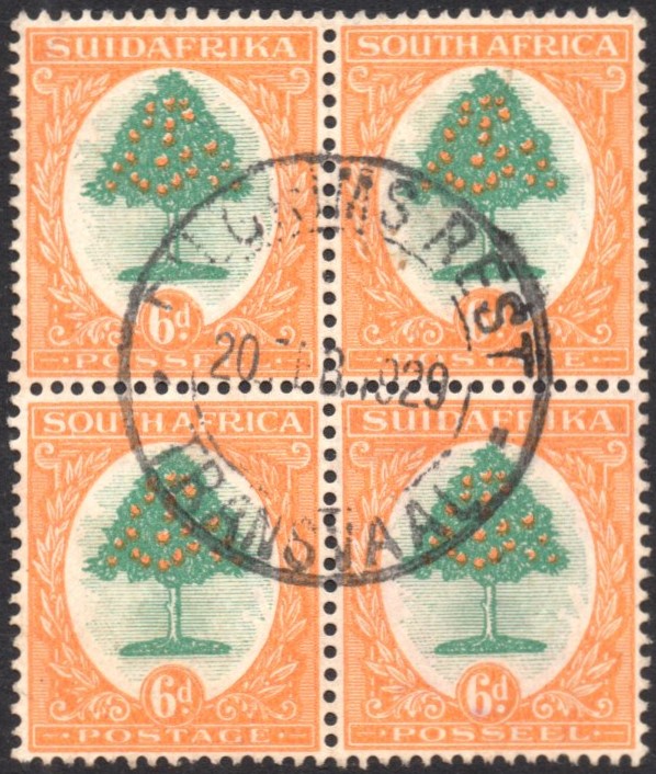 1926-7, SG 32, 6d green & orange, Pretoria printing in a block of four, VFU with 1929 PILGRIMS REST postmark.
